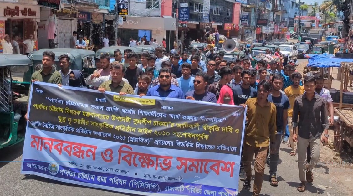 রাঙ্গামাটি:- পার্বত্য চট্টগ্রাম বিষয়ক মন্ত্রণালয়ের উপদেষ্টা সুপ্রদীপ চাকমার ‘আদিবাসী’ স্বীকৃতি দাবি ও ক্ষুদ্র নৃ-গোষ্ঠীর সাংস্কৃতিক প্রতিষ্ঠান আইন ২০১০ সংশোধনপূর্বক জাতি বৈচিত্র্য সাংস্কৃতিক প্রতিষ্ঠান অধ্যাদেশ ২০২৫ প্রণয়নের সিদ্ধান্তের প্রতিবাদে রাঙ্গামাটিতে পার্বত্য চট্টগ্রাম ছাত্র পরিষদের(পিসিসিপি) বিক্ষোভ মিছিল ও সমাবেশ অনুষ্ঠিত হয়েছে। সোমবার সকালে শহরের কাঁঠালতলী থেকে বিক্ষোভ মিছিল শুরু হয়ে বনরূপা সিএনজি স্টেশন চত্বরে সমাবেশে মিলিত হয়।