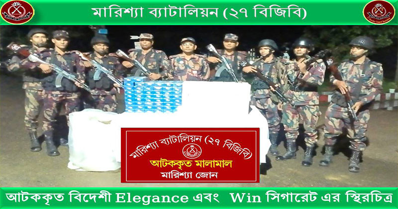 উক্ত অভিযান পরিচালনাকালীন সময়ে চোরাকারবারীরা বিজিবি’র টহল দলের উপস্থিতি টের পেয়ে প্লাস্টিকের বস্তায় বহনকৃত বিদেশী Elegance এবং Win সিগারেট ফেলে পালিয়ে যায়। পরবর্তীতে বিজিবি টহল দল পরিত্যক্ত অবস্থায় Elegance ৭০ কার্টুন এবং Win ৫০ কার্টুন সিগারেট জব্দ করে। উক্ত কার্টুনগুলো খুলে Elegance ৭০০ প্যাকেট এবং Win ৫০০ প্যাকেট বিদেশী ব্রান্ডের সিগারেট পাওয়া যায়। জব্দকৃত সিগারেট এর সর্বমোট সিজার মূল্য ২,৭৫,০০০/- (দুই লক্ষ পঁচাত্তর হাজার) টাকা মাত্র।