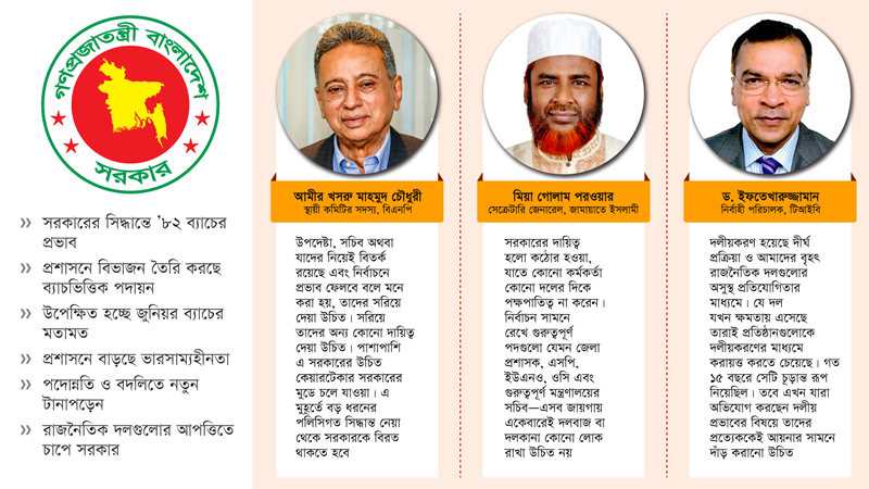 বিশ্লেষকরা বলছেন, অন্তর্বর্তী সরকার গঠনের পর বিগত সরকারের নীতি অনুকরণ, সিদ্ধান্ত গ্রহণে দ্বিধাদ্বন্দ্ব, দৃঢ় পদক্ষেপ না নেয়া, দলীয় আনুগত্য বিবেচনাসহ বেশকিছু কারণে জনপ্রশাসনে সৃষ্টি হয় বিতর্ক। জনপ্রশাসনে যোগ্য ও পেশাদার লোকদের পদায়ন না করার কারণে তৈরি হয়েছে অনাস্থা। বিএনপি-জামায়াত জোটের আমলে সরকারঘনিষ্ঠ পদগুলোয় কর্মরতদের বড় অংশকেই দেয়া হয়েছে চুক্তিভিত্তিক নিয়োগ। তাদের একটি অংশই আবার প্রশাসন ক্যাডারের ’৮২ ব্যাচের কর্মকর্তা।