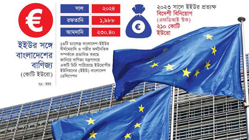 বাণিজ্য মন্ত্রণালয় ও বাংলাদেশে ইইউ ডেলিগেশন সূত্রে জানা গেছে, গত সেপ্টেম্বরে বাণিজ্য মন্ত্রণালয়ের উপদেষ্টা শেখ বশিরউদ্দীন বরাবর একটি চিঠি পাঠিয়েছে ইইউ বাংলাদেশ প্রতিনিধি দলের কার্যালয়। এ চিঠিতে বাংলাদেশ-ইইউ বাণিজ্য ও বিনিয়োগ সম্পর্ক-সংক্রান্ত চ্যালেঞ্জগুলোর একটি তালিকা সংযুক্ত করা হয়েছে। চিহ্নিত নন-ট্যারিফ, নিয়ন্ত্রক, অন্যান্যসহ মোট ১৩টি চ্যালেঞ্জ বাংলাদেশ-ইইউর দীর্ঘমেয়াদি ও গভীর অর্থনৈতিক সম্পর্ককে প্রভাবিত করছে বলে চিঠিতে উল্লেখ করা হয়েছে।