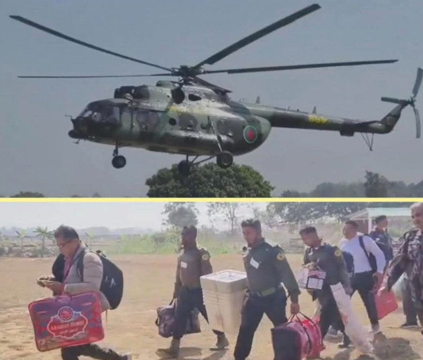 দুর্গম কেন্দ্র থেকে হেলিকপ্টারে করে ফিরছে ভোটের সরঞ্জাম ও কর্মকর্তারা