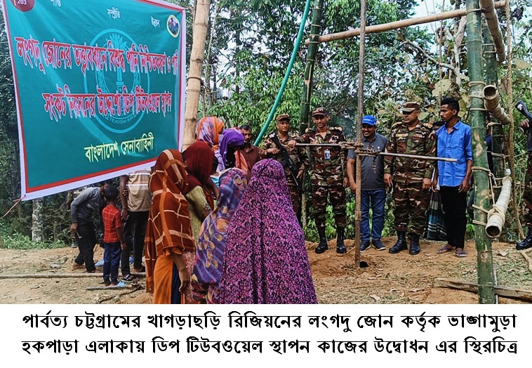 রাঙ্গামাটি:- :- রাঙ্গামাটির লংগদু উপজেলায় বিশুদ্ধ পানির সংকট নিরসনে সোলার চালিত ডিপ টিউবওয়েল স্থাপন করেছে বাংলাদেশ সেনাবাহিনীর লংগদু জোন। উপজেলার ভাঙ্গামুড়া হকপাড়া এলাকায় এ টিউবওয়েল স্থাপনের মাধ্যমে স্থানীয় জনগণের জন্য নিরাপদ পানির নতুন দ্বার উন্মোচিত হয়েছে।