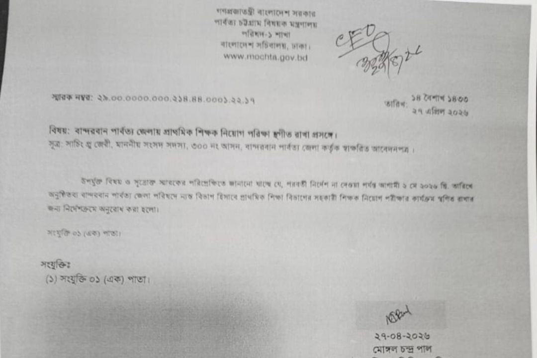 চিঠিতে বলা হয়, “উপর্যুক্ত বিষয় ও সূত্রোক্ত স্মারকের পরিপ্রেক্ষিতে জানানো চাচ্ছে যে, পরবর্তী নির্দেশ না দেওয়া পর্যন্ত আগামী ২ মে ২০২৬ খ্রি. তারিখে অনুষ্ঠিতব্য বান্দরবান পার্বত্য জেলা পরিষদে ন্যস্ত বিভাগ হিসেবে প্রাথমিক শিক্ষা বিভাগের সহকারী শিক্ষক নিয়োগ পরীক্ষার কার্যক্রম স্থগিত রাখার জন্য নির্দেশক্রমে অনুরোধ করা হলো”।
