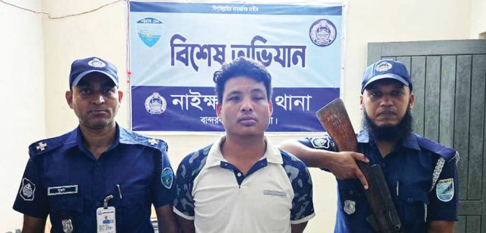 বান্দরবান:- বান্দরবানের নাইক্ষ্যংছড়ি উপজেলায় স্কুল শিক্ষিকাকে মারধরের পর ধর্ষণচেষ্টার অভিযোগে এক মারমা যুবককে গ্রেপ্তার করেছে পুলিশ। গত বুধবার সন্ধ্যায় উপজেলার সোনাইছড়ি ইউনিয়নের জারুলিয়া এলাকার গহীন পাড়া থেকে ওই যুবককে গ্রেপ্তার